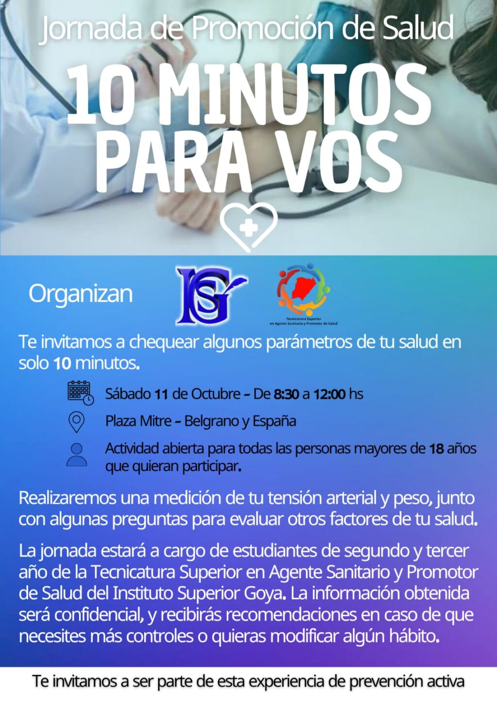 La invitación es a tomarte 10 minutos de tu tiempo, el sábado 11 de octubre, desde las 8,30 y hasta las 12 horas, en plaza Mitre, para chequear algunos parámetros de tu salud.