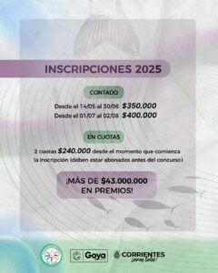 La Comisión Organizadora informa la modalidad de pago para participar del concurso: Efectivo, Transferencia; Débito (página Web); Crédito (página Web), se puede abonar en dos cuotas, con la única condición que deberá estar cancelada antes del concurso.