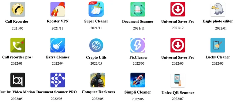 La lista de estas aplicaciones estaba conformada por Just In: Video Motion, Document Scanner Pro, Conquer Darkness, Simpli Cleaner, Unicc QR Scanner, Call Recorder, Call Recorder pro +, Rooster VPN, Super Cleaner, Universal Saver Pro, Eagle photo edit, Extra Cleaner, Crypto Utils, FixCleaner, Lucky Cleaner.