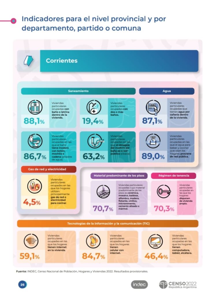 El nuevo informe del INDEC difundido este viernes sobre datos que se desprenden del Censo Nacional de Población, Hogares y Viviendas 2022 revela que Corrientes se ubica entre las provincias argentinas con más cantidad de viviendas propias, en el quinto lugar con un 70,3%, por arriba de la media nacional de 65,5%. Y en el Nordeste es la que más casas tiene con agua corriente de red, llegando a un 89,0%. Son dos datos positivos para una provincia que padece discriminación del actual Gobierno nacional y del cuál el gobernador de Corrientes, Gustavo Valdés viene bregando para cambiarlo en las próximas elecciones nacionales.