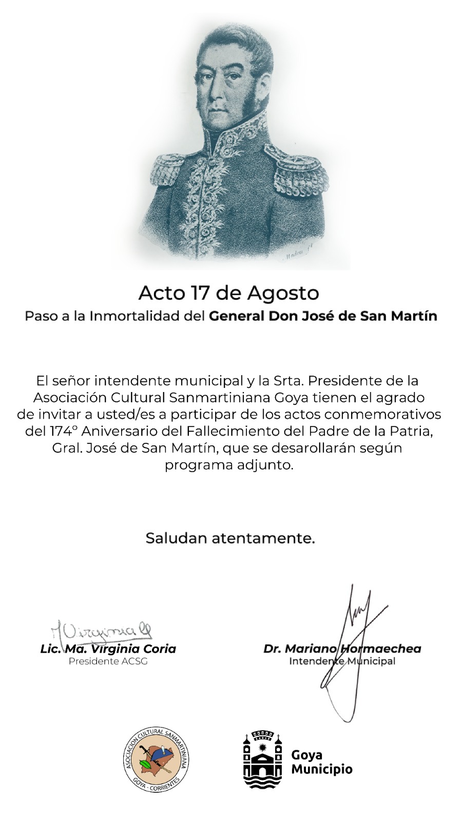 El señor intendente municipal Dr. Mariano Hormaechea y la Srta. presidente de la Asociación Cultural Sanmartiniana Goya Lic. Ma. Virginia Coria, tienen el agrado de invitar a la ciudadanía toda a participar de los actos conmemorativos del 174º aniversario del fallecimiento del “Padre de la Patria”, Gral. José de San Martín, que se desarrollará según el siguiente programa de actos.