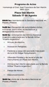 El señor intendente municipal Dr. Mariano Hormaechea y la Srta. presidente de la Asociación Cultural Sanmartiniana Goya Lic. Ma. Virginia Coria, tienen el agrado de invitar a la ciudadanía toda a participar de los actos conmemorativos del 174º aniversario del fallecimiento del “Padre de la Patria”, Gral. José de San Martín, que se desarrollará según el siguiente programa de actos.
