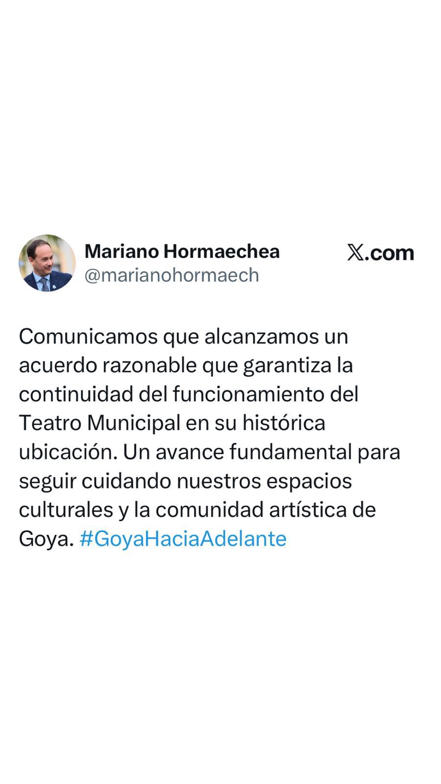 El intendente Mariano Hormaechea en su cuenta oficial adelantó el acuerdo de la continuidad del Teatro: “Comunicamos que alcanzamos un acuerdo razonable que garantiza la continuidad del funcionamiento del Teatro Municipal, en su histórica ubicación. Un avance fundamental para seguir cuidando nuestros espacios culturales y la continuidad artística de Goya”.