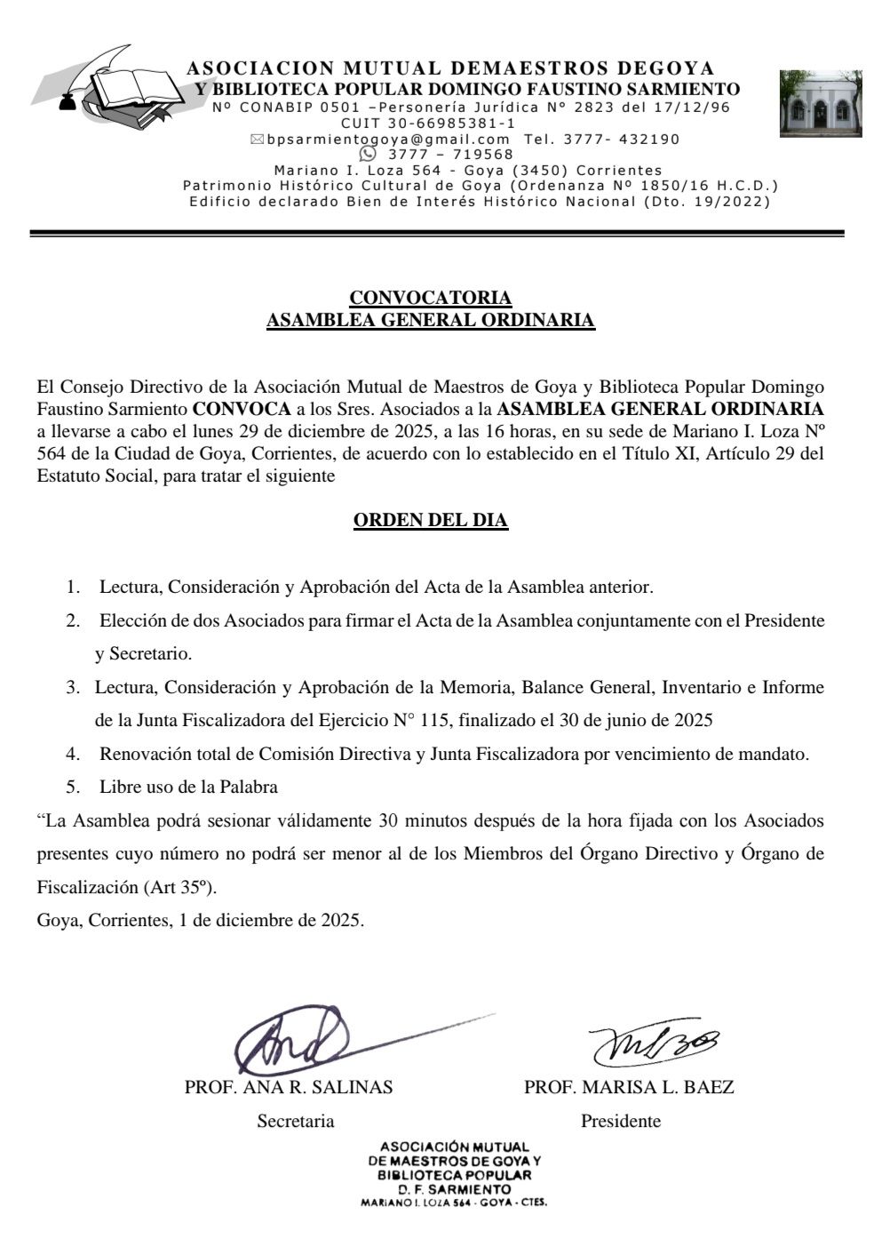 El Consejo Directivo de la Asociación Mutual de Maestros de Goya y Biblioteca Popular Domingo Faustino Sarmiento CONVOCA a los señores asociados a la ASAMBLEA GENERAL ORDINARIA a llevarse a cabo el lunes 29 de diciembre de 2025, a las 16 horas, en su sede de calle Mariano I. Loza 564 de la ciudad de Goya, Corrientes, de acuerdo a lo establecido en el Título XI, artículo 29º del Estatuto Social, para tratar el siguiente: