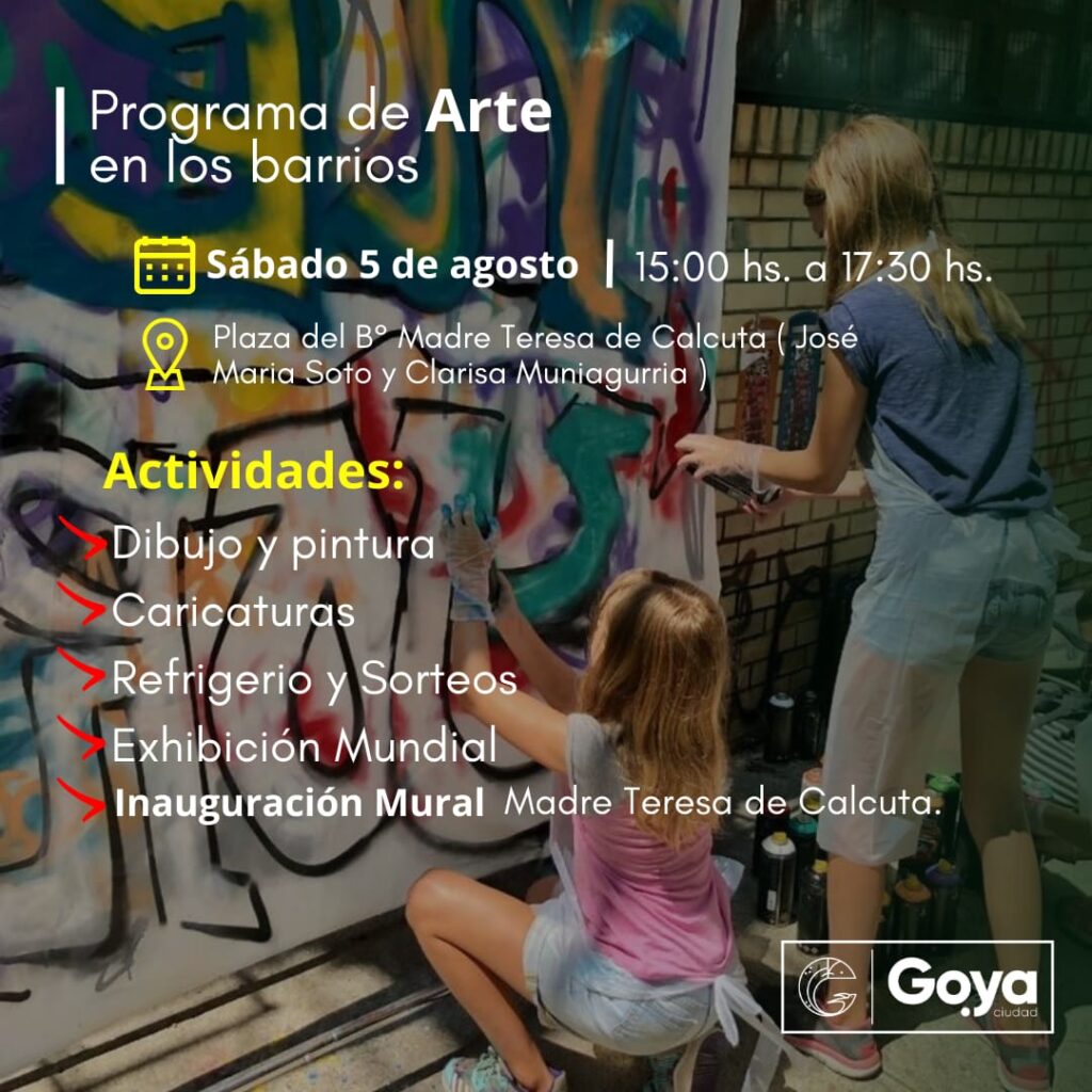 Los vecinos del Barrio Madre Teresa de Calcuta están invitados al evento cultural que promete llenar de color y creatividad la Plaza del barrio. El “Programa de Arte en los Barrios”, organizado por la Secretaría de Educación de la Municipalidad de Goya, bajo la dirección de la doctora Sonia Espina, se llevará a cabo este sábado 5 de agosto, desde las 15 hasta las 17.30 horas.