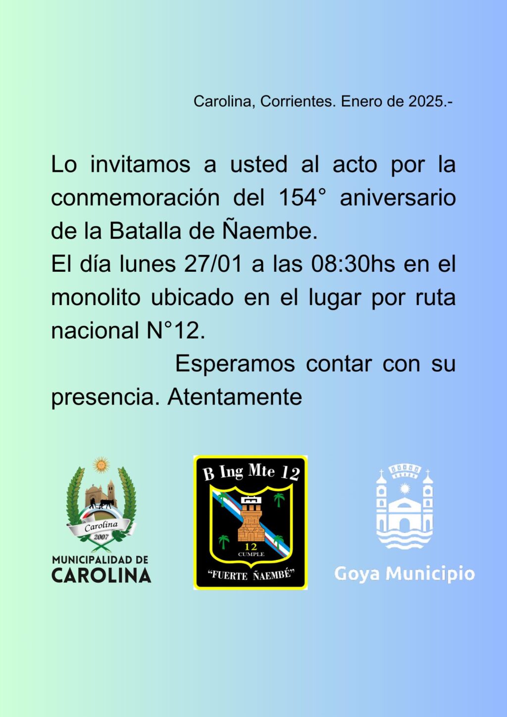 Los Municipios de Goya y Carolina junto al Batallón de Ingeniero de Monte 12 invitan al acto conmemorativo del 154º Aniversario de la Batalla de Ñaembe.