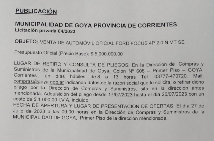 LICITACIÓN: VENTA DE AUTOMÓVIL OFICIAL FORD FOCUS 4P 2.0 N MT SE