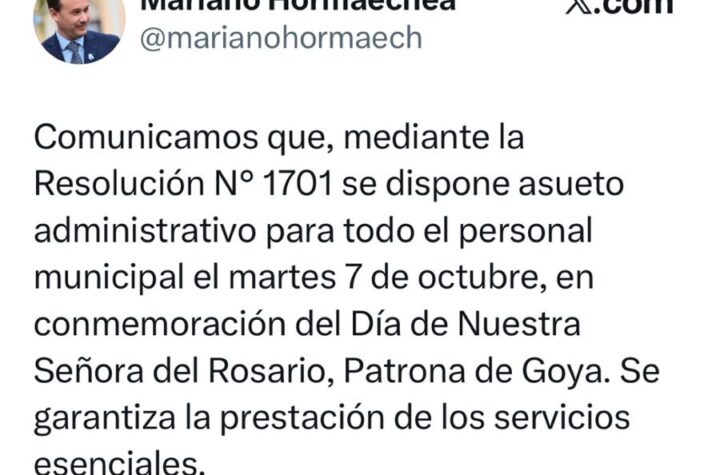 Locales RESOLUCIÓN Nº 1.701: DISPONIENDO ASUETO ADMINISTRATIVO POR CONMEMORACION DEL DIA DE NUESTRA SEÑORA DEL ROSARIO 3 días atras