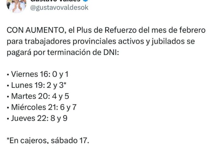 Política Provinciales PLUS DE REFUERZO CON AUMENTO: VALDÉS ANUNCIA DÍAS DE PAGO DEL ADICIONAL DE FEBRERO 2 años atras