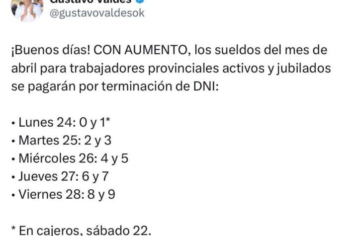 Provinciales CON AUMENTO: EL GOBERNADOR VALDÉS ANUNCIÓ EL CRONOGRAMA DE PAGO DEL MES DE ABRIL 3 años atras