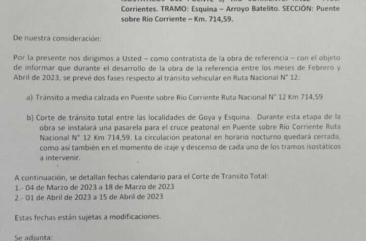 Provinciales INTERRUMPIRÁN EN TRÁNSITO EN EL PUENTE QUE UNE GOYA Y ESQUINA PARA REPARARLO 3 años atras