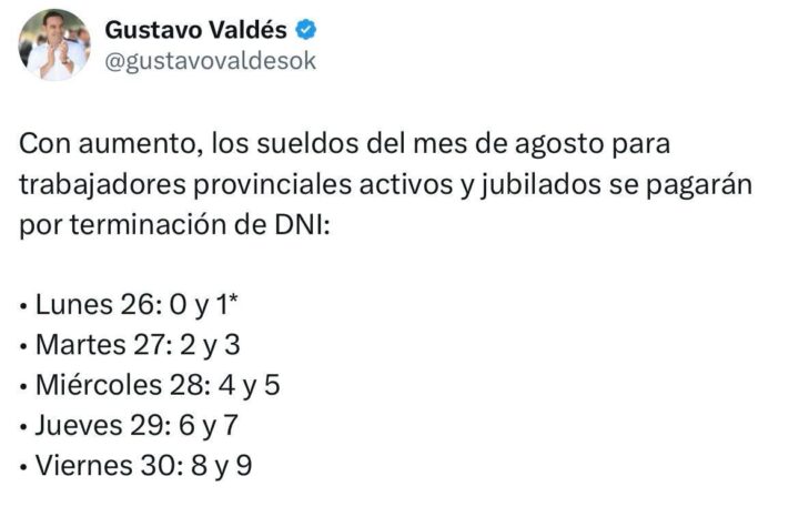 Economía Provinciales SUELDO DE AGOSTO: VALDÉS DIO A CONOCER CRONOGRAMA DE PAGO CON AUMENTO 1 año atras