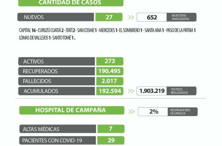 Provinciales Salud DOMINGO 29 DE MAYO: CORRIENTES REGISTRA 27 CASOS NUEVOS DE CORONAVIRUS: 16 EN CAPITAL Y 11 EN EL INTERIOR 3 años atras