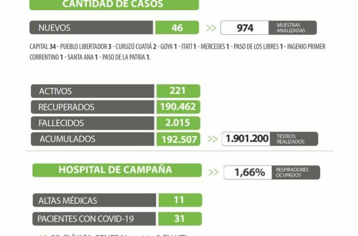 Provinciales Salud VIERNES 27 DE MAYO: CORRIENTES REGISTRA 46 CASOS NUEVOS DE CORONAVIRUS: 34 EN CAPITAL Y 12 EN EL INTERIOR 3 años atras