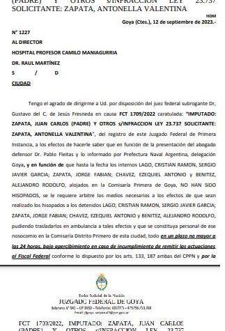 Locales Salud LA JUSTICIA FEDERAL INTIMA AL HOSPITAL DE GOYA PARA QUE REALICE HISOPADOS EN LA COMISARÍA 1ª 2 años atras