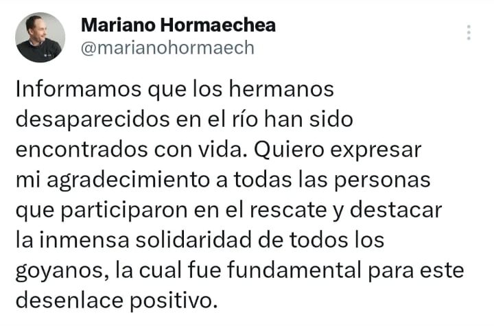 Locales Sociales MARIANO HORMAECHEA COMPARTE LA NOTICIA DE LA APARICIÓN DE LOS HERMANOS DESAPARECIDOS EN EL RIO 2 años atras