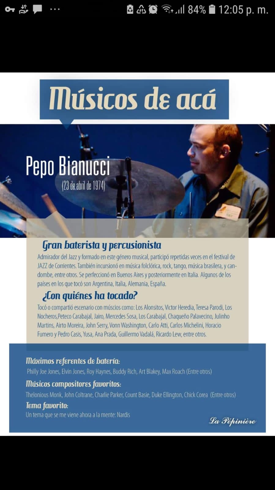 En Italia tomó clases con Roberto Faenzi, un baterista diplomado en Berklee a quien recuerda con mucho cariño por su generosidad y por haberle inculcado el amor por el jazz, género que adoptó como “su música” porque lo inspira y siente que se refleja más que en ningún otro el estado de ánimo, la expresión y la espontaneidad.