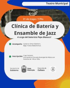 Se invita a los interesados en recabar información y registrar su inscripción para la clínica del 31 de mayo, concurrir a la Casa de la Cultura, donde funciona la Escuela Municipal de Música de 14 a 18 horas, recordando que los cupos son limitados.