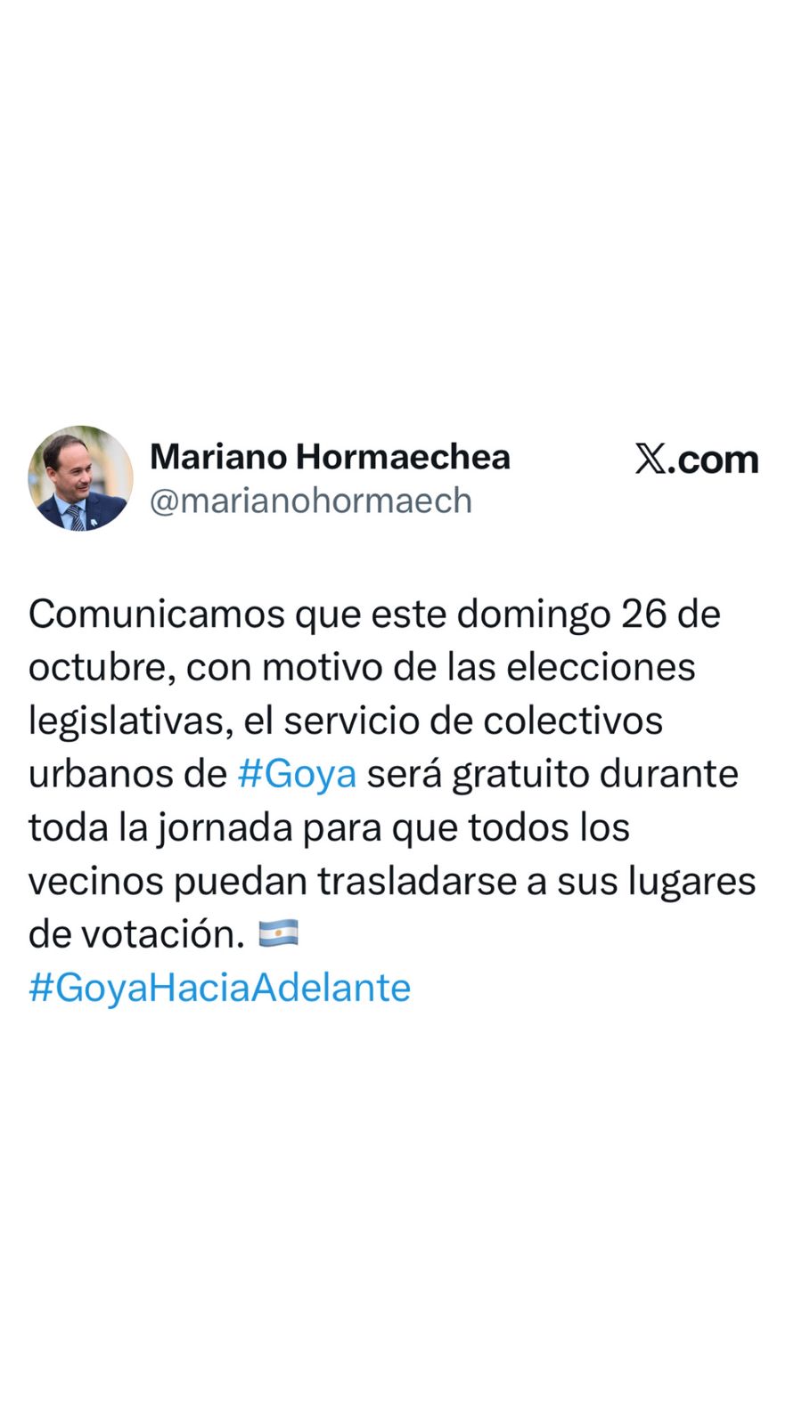 “Comunicamos que este domingo 26 de octubre, con motivo de las elecciones legislativas, el servicio de colectivos urbanos de Goya será gratuito durante toda la jornada para que todos los vecinos puedan trasladarse a sus lugares de votación y poder emitir su sufragio”, expresó el jefe comunal de nuestra ciudad.