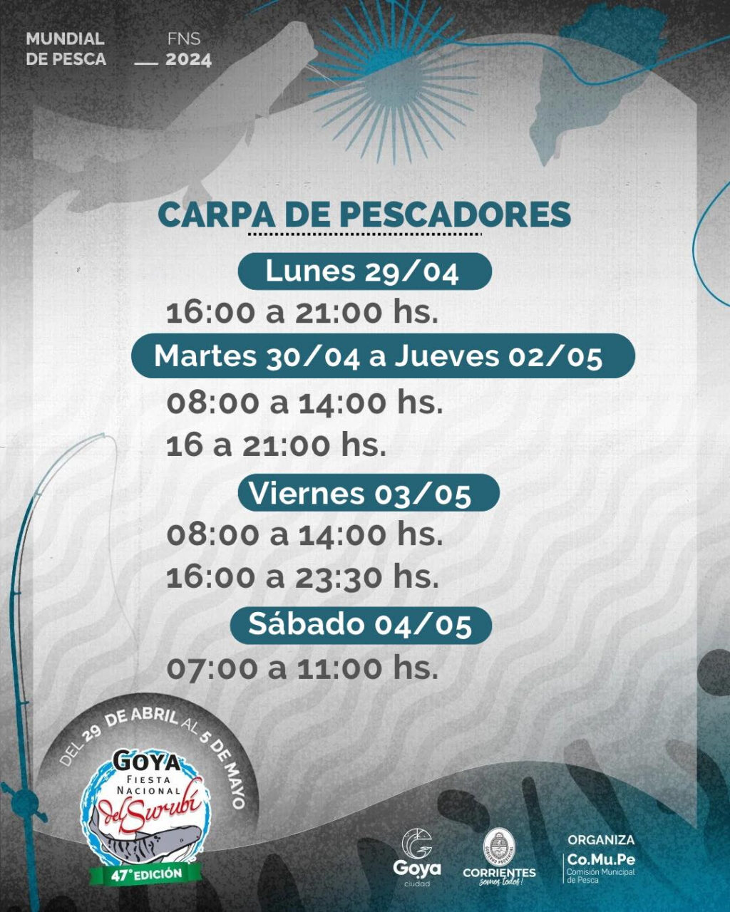 Desde las 16 hs de este lunes 29 de abril comienza a funcionar la carpa de pescadores. Destinado a los protagonistas de la Fiesta Nacional del Surubí, estará a disposición de los equipos que participarán de la edición2024 para recibirlos, asesorarlos, y entregar los correspondientes kits de pescadores. La carpa estará ubicada en Playa El Ingá.