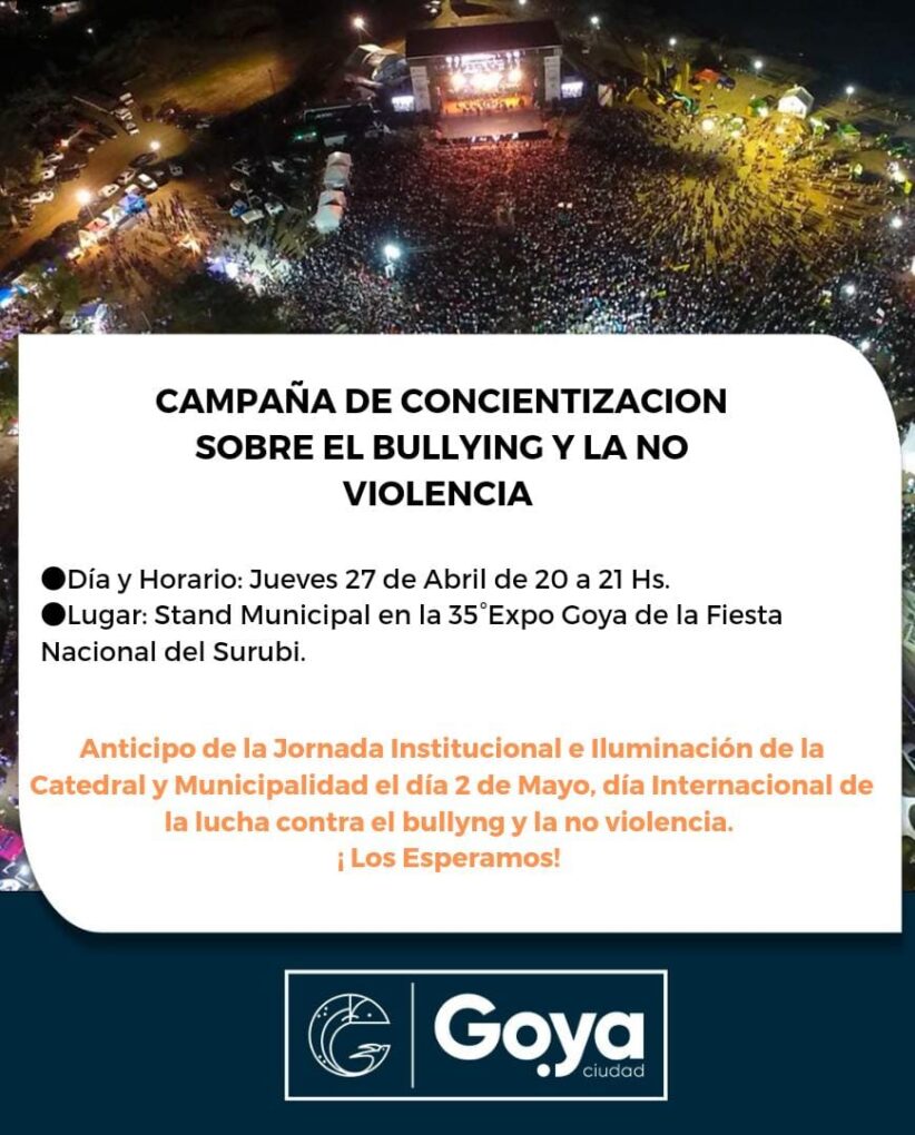 El jueves 27, de 20 a 21 horas, la Secretaría de Educación hará una actividad de concientización sobre Bullying en el stand municipal emplazado en Costa Surubí. Se invitará a las actividades centrales que se harán el 2 de mayo, para conmemorar la jornada del Bullying.
