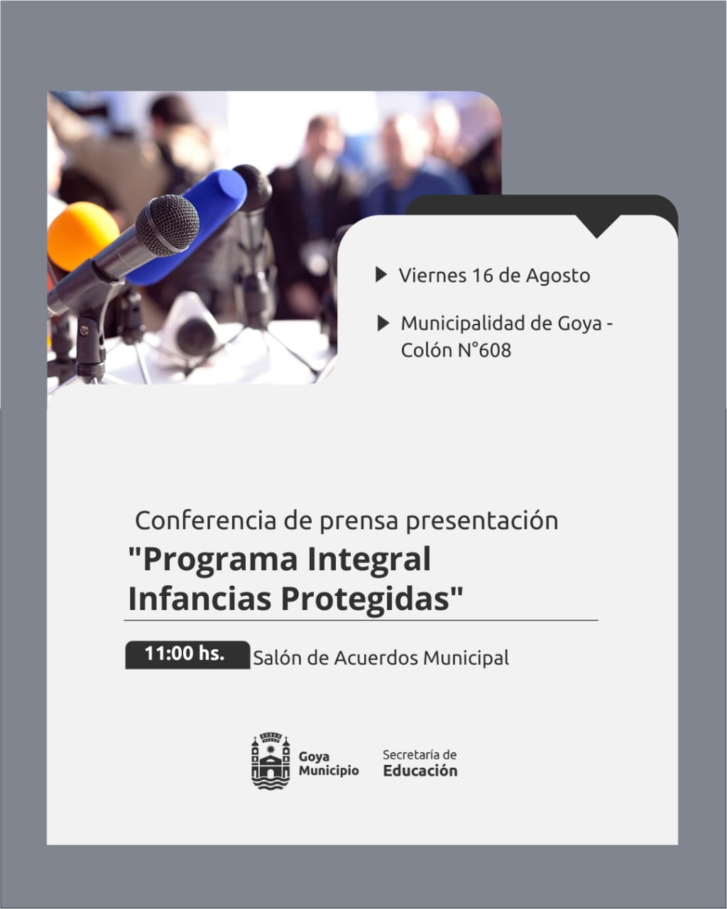 Este viernes 16 de agosto a las 11 horas, en el salón de Acuerdos de la Municipalidad de Goya se llevará a cabo la conferencia de prensa donde se presentará el “Programa Integral Infancias Protegidas”. Esta iniciativa, que promete ser un pilar fundamental en la protección y desarrollo de los más jóvenes en la comunidad, busca brindar un enfoque integral en el cuidado de la infancia.