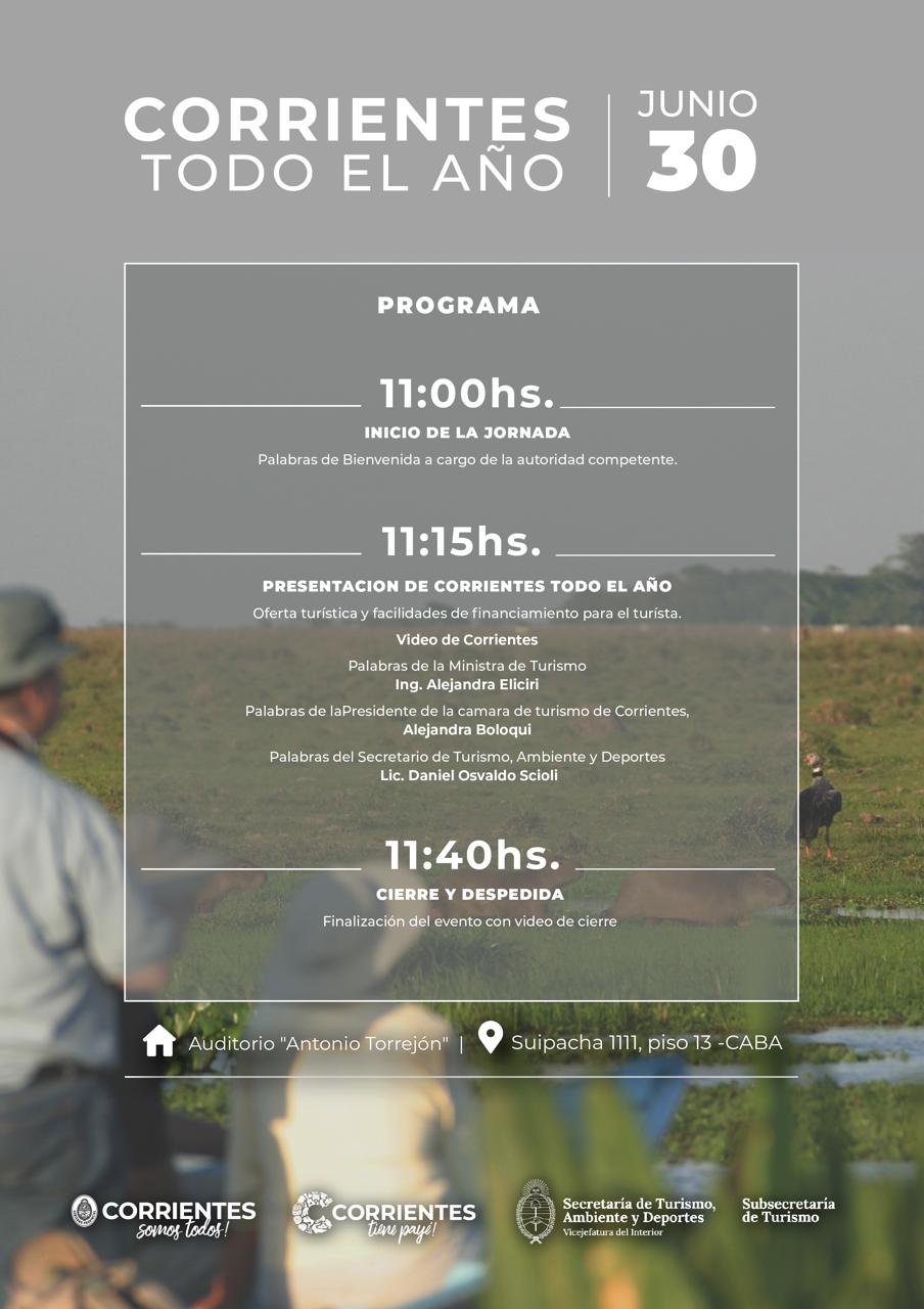 La cita, en primer lugar, será en el auditorio Antonio Torrejón de la Secretaría de Turismo y Deportes de la Nación, a las 11 mientras que a partir de las 15 horas la propuesta turística de Corrientes todo el año se trasladará hasta la sede de la Casa de Corrientes en Capital Federal. Mediante una conferencia de prensa por la mañana, se informará a periodistas especializados acerca de las bondades culturales y naturales en la tierra del taragüí, en tanto que en la siesta porteña se hará lo propio ante agentes de viajes y operadores de turismo.