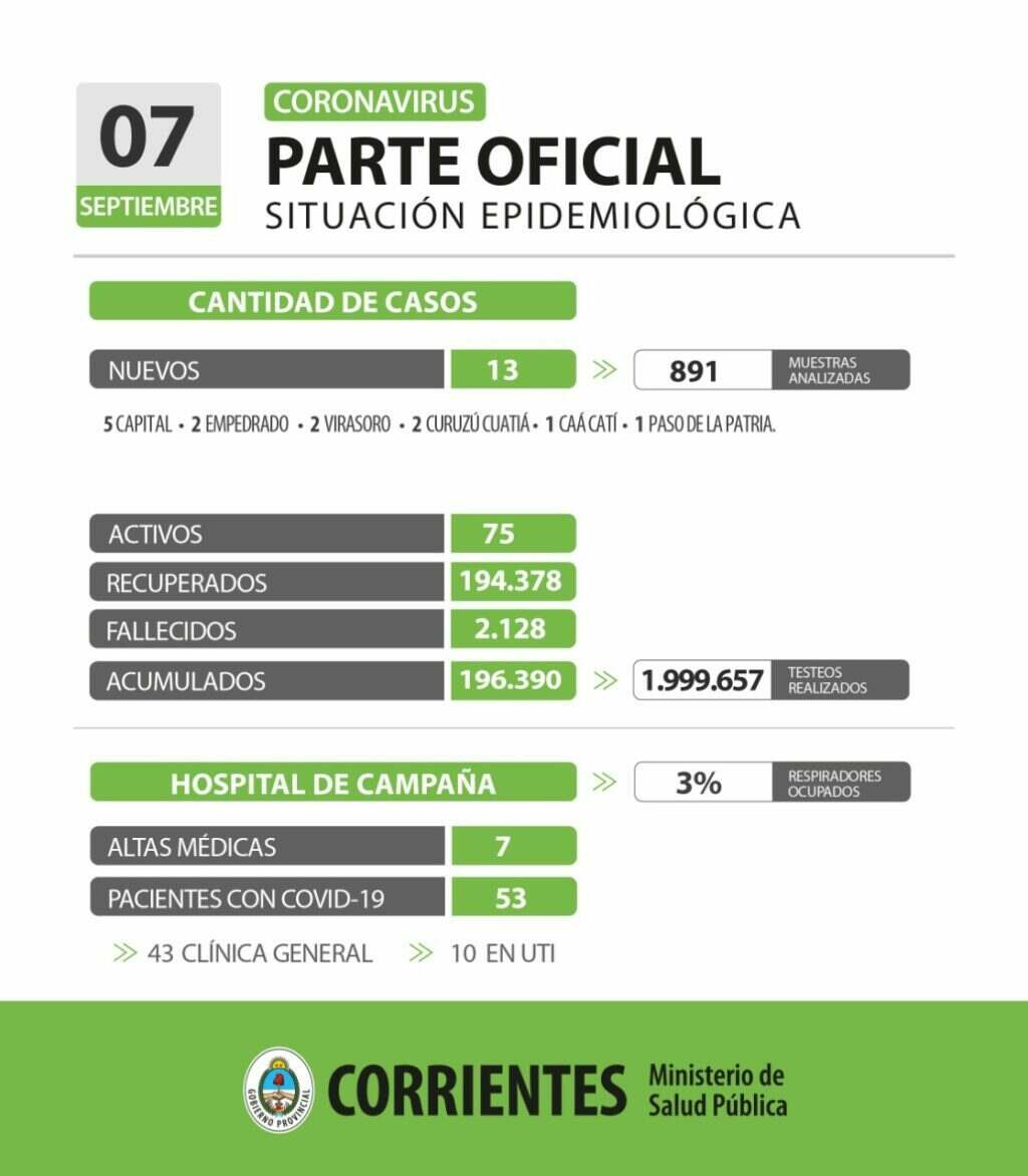El informe epidemiológico de la provincia de Corrientes registró este miércoles, 13 nuevos casos positivos de Coronavirus, de los cuales 5 fueron contagios en la ciudad Capital y los 8 restantes en 5 localidades del interior provincial, al haberse analizado 891 muestras en las últimas 24 horas.