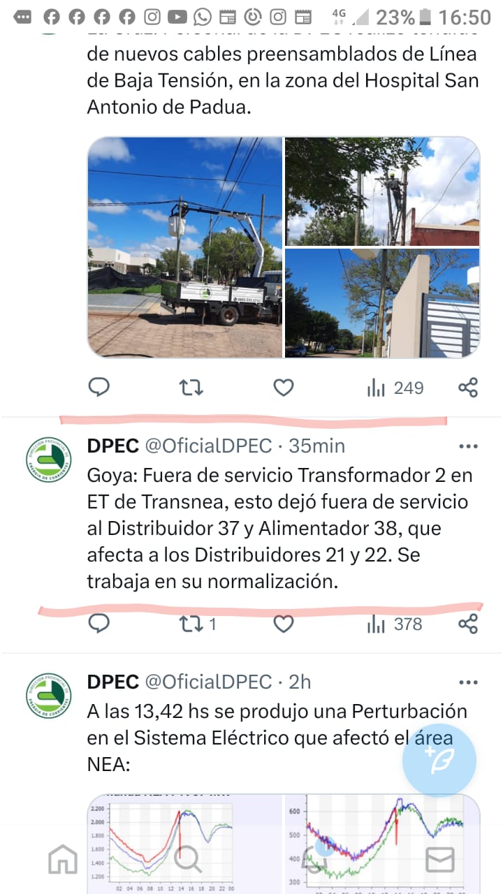 Desde la Jefatura de la Dirección de Energía, informaron: “Se tuvo que realizar una transferencia de carga en Transnea, el interruptor de la zona rural se encuentra fuera de servicio aún, el interruptor no está funcionando, en tal sentido el personal de la Dirección de Energía, realiza unas maniobras, que deben hacerse de manera manual para cerrar la zona de Rincón de Gomez y abastecer el sector de Carolina, la zona rural este de Goya, Maruchas, Batel, Ifrán se irá restableciendo de forma paulatina, la zona céntrica se ha restablecido la provisión de la energía eléctrica.”