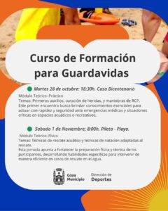 Planificando la próxima temporada estival, la Municipalidad de Goya, por medio de la Dirección de Deportes, dependiente de la Secretaría de Gobierno, ha dispuesto la oferta de formación de guardavidas, en la modalidad teórico-práctico, sumando técnicas de rescate, primeros auxilios, entre otros puntos clave para la capacitación.