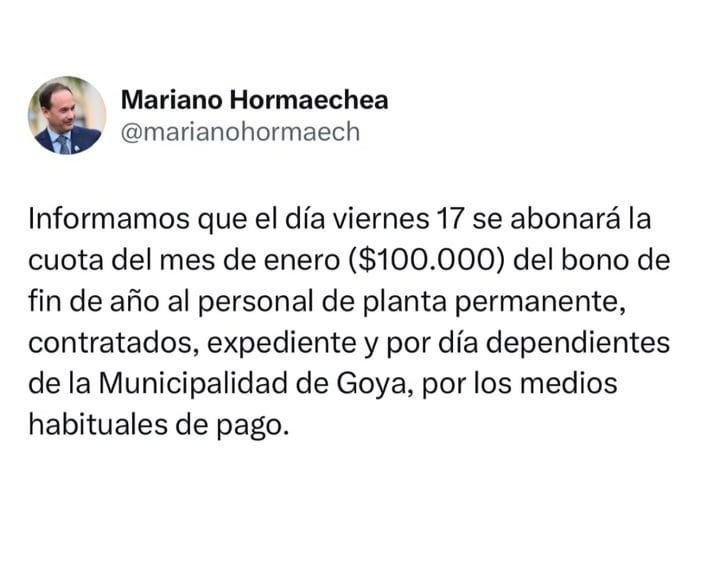 En su mensaje oficial, el jefe comunal de Goya expresó: “Informamos que el día viernes 17 se abonará la cuota del mes de enero ($100.000) del bono de fin de año al personal de planta permanente, contratados, expediente y por día dependientes de la Municipalidad de Goya, por los medios habituales de pago.”