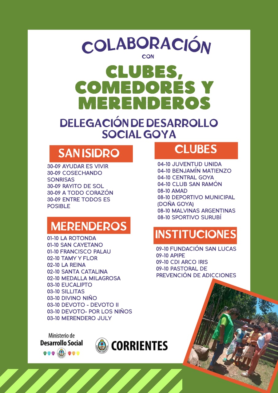 La citada repartición provincial, delegación Goya mensualmente brinda asistencia para brindar la copa de leche, merienda, almuerzo o refrigerio a las siguientes entidades: