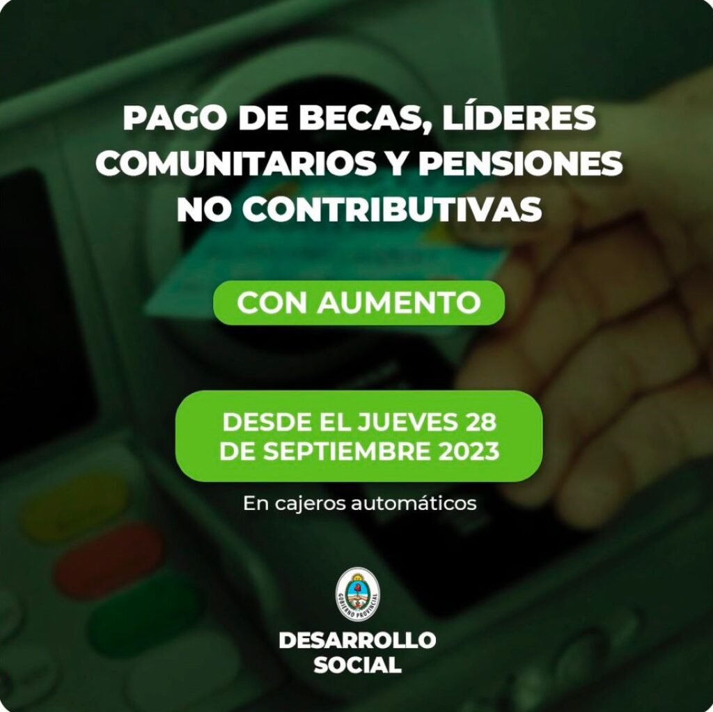 El Ministerio de Desarrollo Social de la provincia, informa a beneficiarios, que desde este jueves 28 de septiembre del 2023, estará disponible el pago de BECAS, Pensiones No Contributivas y Líderes Comunitarios dependientes de este organismo con aumento.