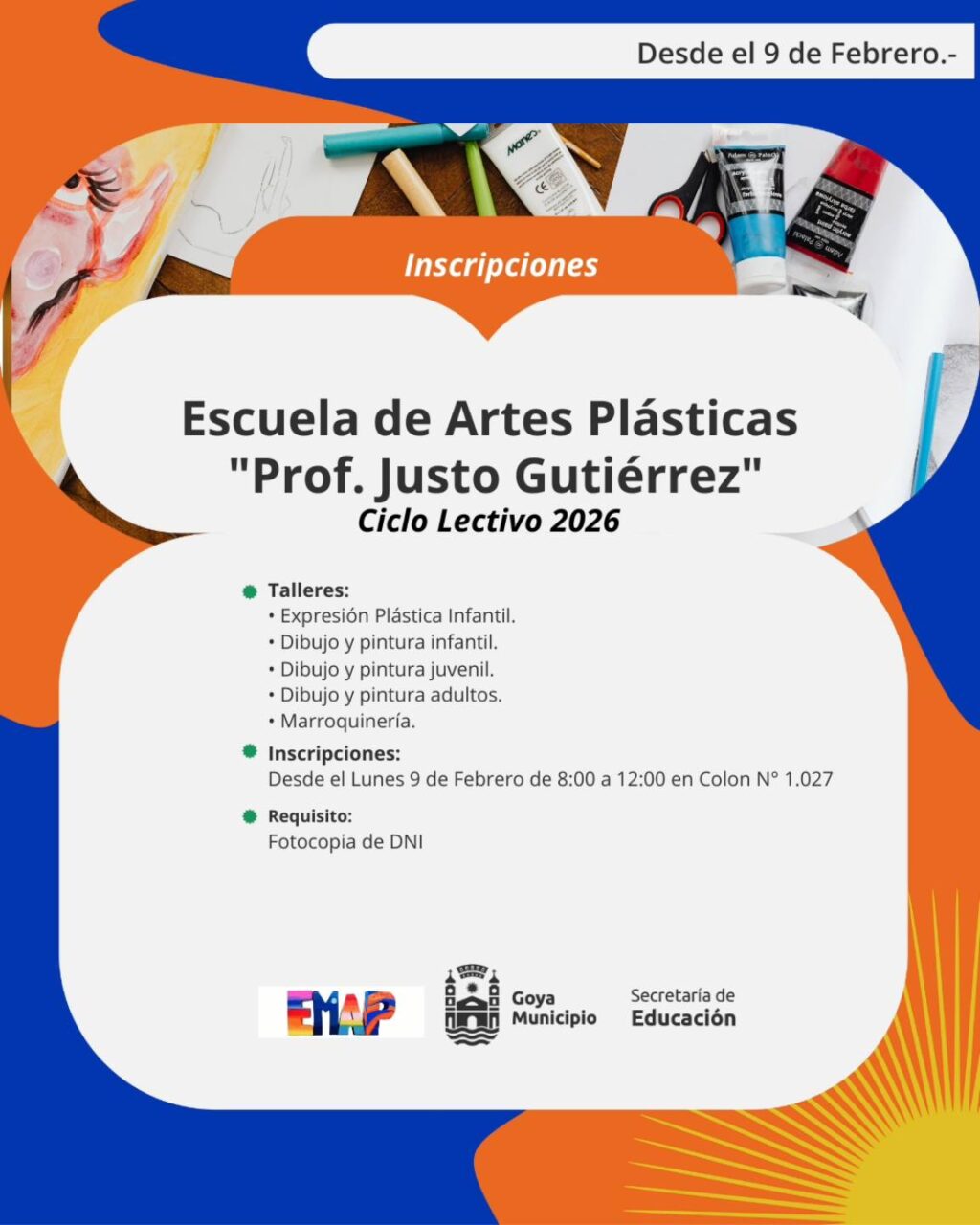 La Escuela Municipal los espera para seguir creando juntos.Desde el lunes 9 de febrero, toda persona interesada puede acercarse a Colón 1027, de 8:00 a 12:00 hs, con su fotocopia de DNI y realizar la inscripción a los siguientes talleres: