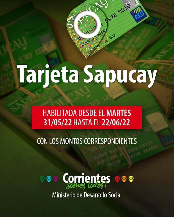 El Ministerio de Desarrollo Social del Gobierno de Corrientes, a cargo de Adán Gaya, informa a los beneficiarios del Programa que las Tarjetas Sapucay desde este martes 31 de Mayo estarán habilitadas hasta el 22 de junio del 2022.