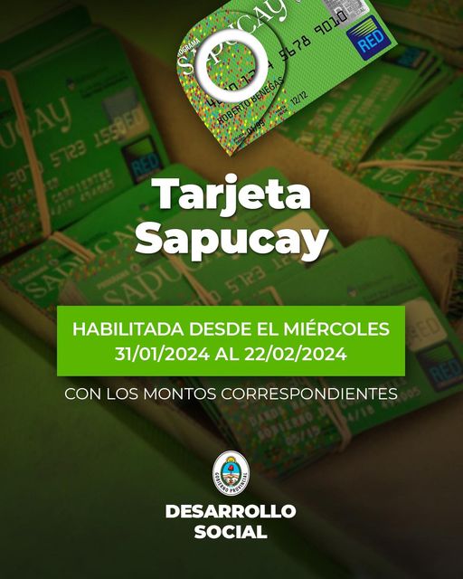 El Ministerio de Desarrollo Social del Gobierno de Corrientes, comunica que a partir de este miércoles 31 de enero se habilitarán las Tarjetas Sapucay. Las mismas estarán activas hasta el 22 de febrero del 2024.