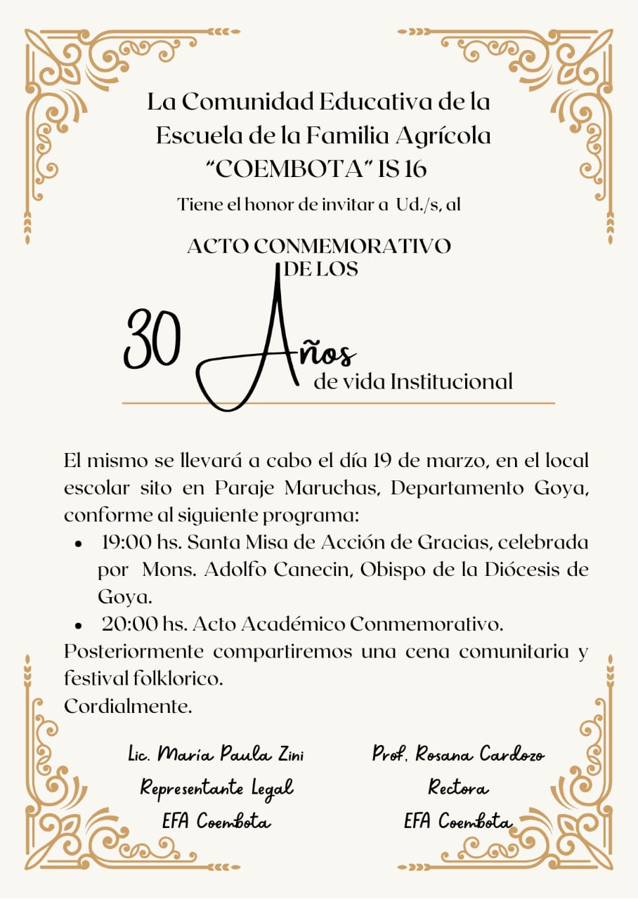 El festejo del acontecimiento se realizará el 19 de marzo en el mencionado establecimiento escolar a partir de las 19 horas. Se celebrará misa de Acción de Gracias, presidida por el obispo de la diócesis de Goya monseñor Adolfo Canecin, proseguirá con el acto protocolar y concluirá con una cena comunitaria y festival artístico.