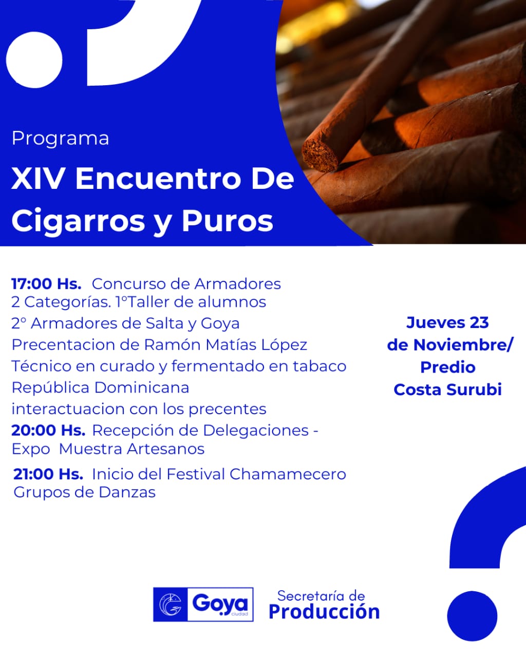 El jueves 23 comenzará el 14º Encuentro de Cigarros y Puros. El evento se realizará en Costa Surubí de Goya. Contará con la participación de expertos de la República Dominicana, de la UNNE,  y otras organizaciones.