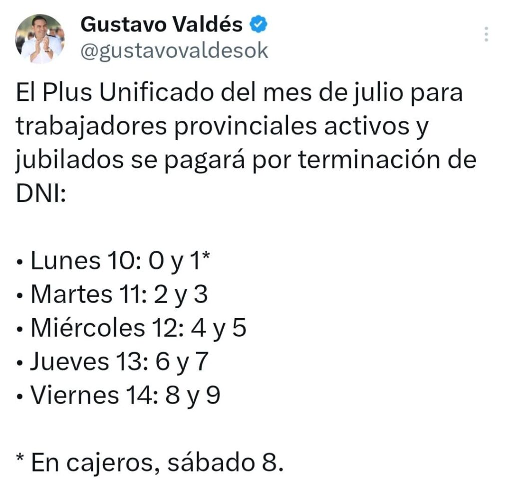 Luego de darse a conocer el cuarto aumento salarial del 2023, el gobernador Gustavo Valdés anunció este viernes el cronograma del Plus Unificado correspondiente a julio, para los trabajadores provinciales activos y jubilados. Inicia este lunes 10 con los Documentos Nacionales de Identidad (DNI) finalizados en 0 y 1, pero los mismos ya lo tendrán disponible desde este sábado en Cajeros Automáticos.