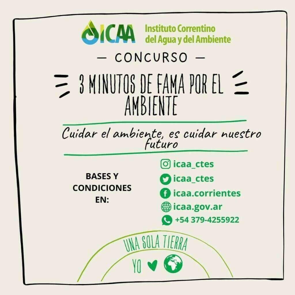 “Tres Minutos de fama por el Ambiente”, es el concurso de audiovisuales organizado por el Instituto Correntino del Agua y del Ambiente (ICAA), con motivo del Día Mundial del Medio Ambiente que se celebra el próximo 5 de junio, dirigido a escuelas secundarias de la provincia.