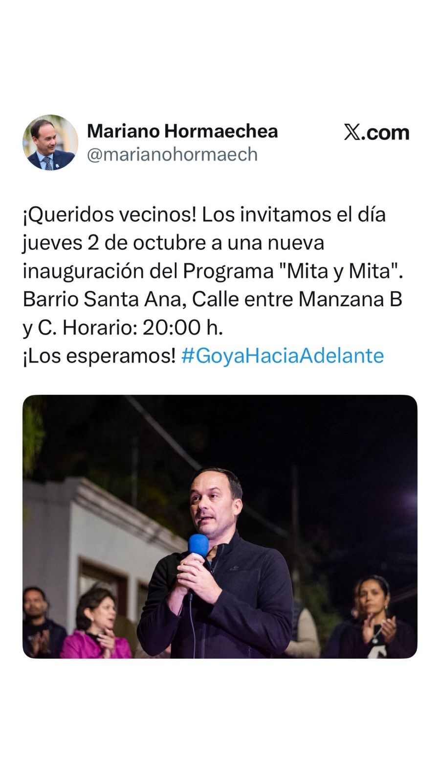 En la invitación cursada a la ciudadanía, expresa: “¡Queridos Vecinos! Los invitamos el día jueves 2 de octubre a una nueva inauguración del Programa “Mita y Mita”, Barrio Santa Ana, Calle entre Manzanas B y C. Horario 20 horas. ¡Los esperamos!”