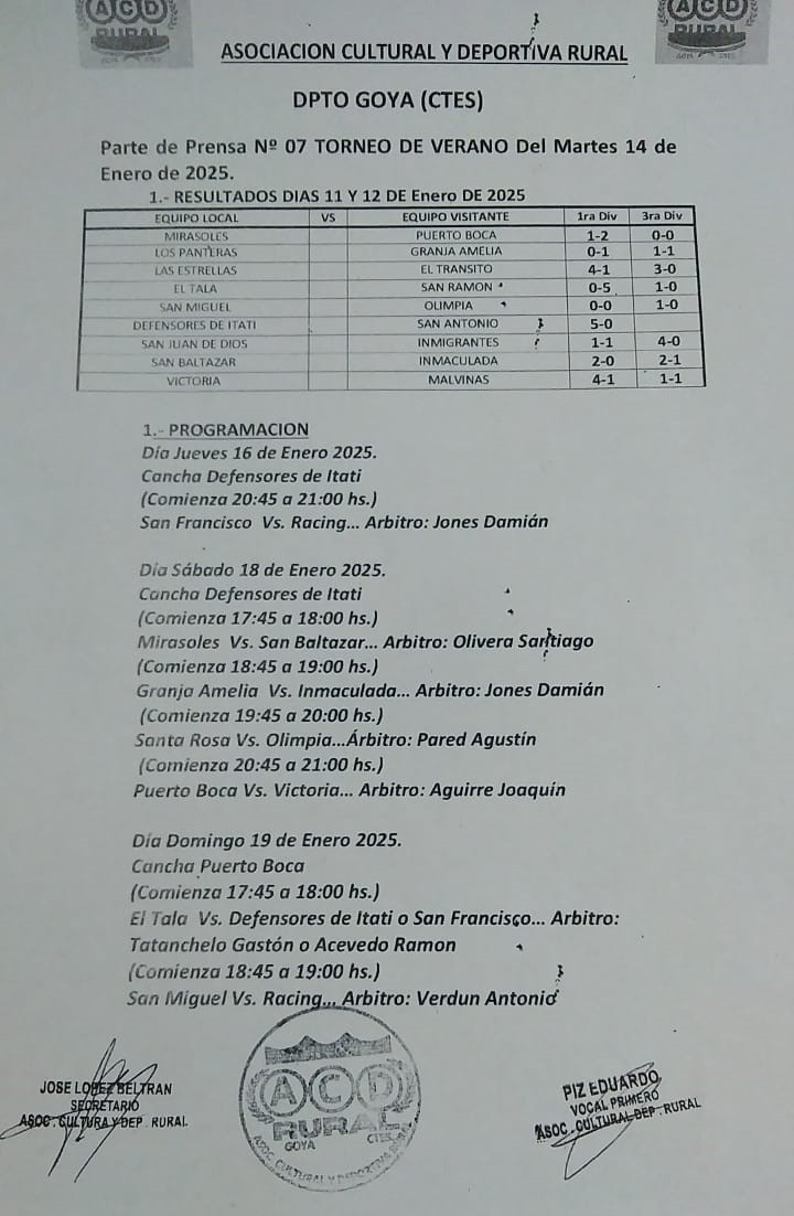 La Asociación Cultural y Deportiva Rural se apresta a vivir una nueva experiencia deportiva: este fin de semana se juegan los octavos de final en 3ª División del Fútbol Rural. El último fin de semana de enero se esperan los enfrentamientos finales en 1ª División y a fines de febrero se estaría terminando el campeonato de Verano del Fútbol Rural.