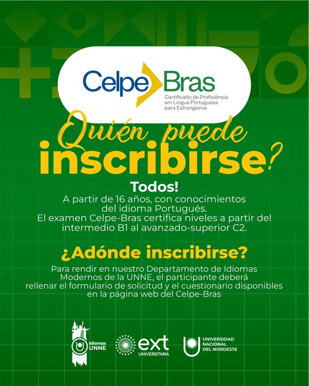 El Departamento de Idiomas Modernos de la UNNE (DIM) es puesto aplicador del examen Celpe-Bras en la Región Nordeste de Argentina acreditado desde 2006 y único en el NEA. El Certificado de Competencia en Portugués para Extranjeros (CELPE-Bras Certificado de Proficiência em Língua Portuguesa para Estrangeiros) es reconocido oficialmente por el gobierno brasileño y aceptado a nivel internacional por empresas e instituciones educativas como prueba de competencia en el idioma portugués. En ese marco, desde Idiomas UNNE, convocan a la inscripción de la segunda edición 2024 del examen, que será desde el 5 al 16 de agosto próximo.