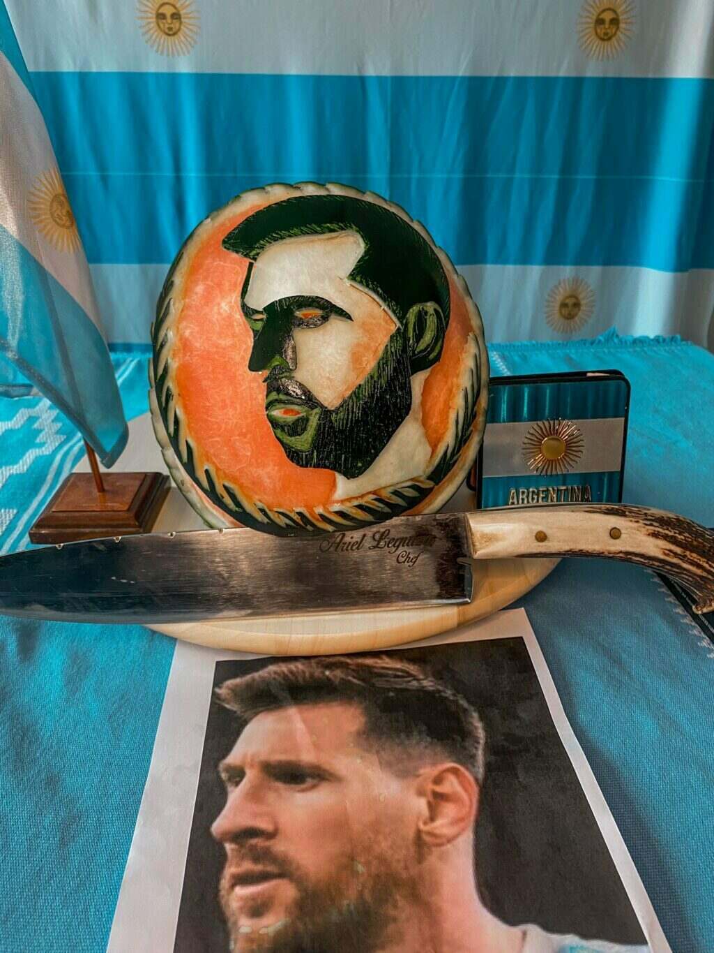Leguiza, fue ganador en distintos certámenes gastronómicos de nivel internacional. Confiesa Leguiza en Radio Ciudad que “salió la idea de tallar la cara de Messi porque nos representa a la Argentina y ya en una oportunidad anterior cuando falleció Maradona tallé la cara de Diego Maradona y en esta oportunidad quería rendir honor a Messi”.