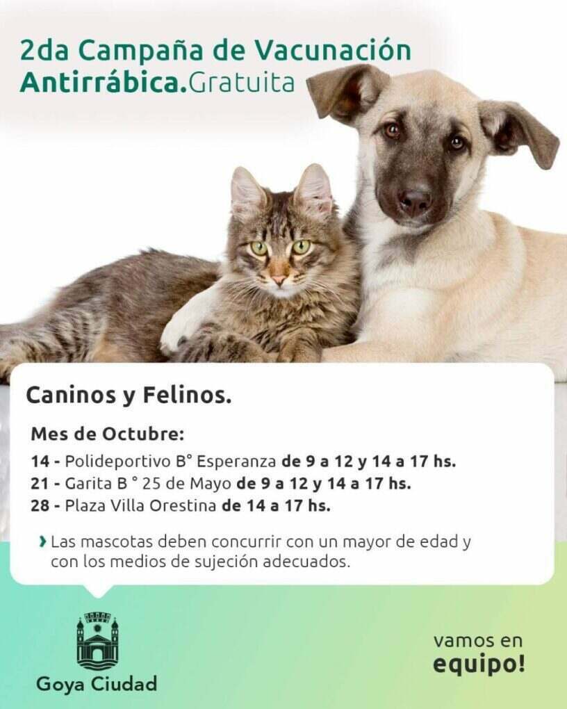 En el marco de la Segunda Campaña de Vacunación Antirrábica para caninos y felinos, este viernes 14 personal de la Dirección de Bromatología estará realizando un operativo en el polideportivo de Barrio Esperanza de 9 a 12 y de 14 a 17 horas.