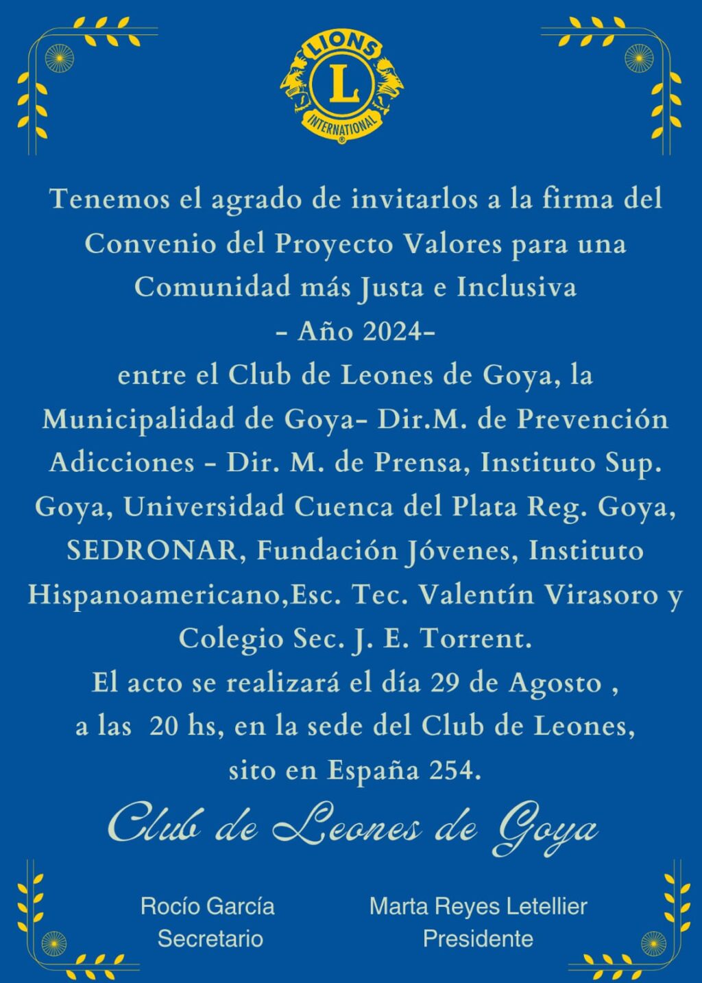 El próximo 29 de agosto, a las 20 horas, se llevará a cabo la firma del Convenio del proyecto “Valores para una Comunidad más Justa e Inclusiva – Año 2024” en la sede del Club de Leones de Goya, ubicada en calle España 254. Este significativo acto contará con la participación de una amplia variedad de instituciones locales y regionales comprometidas con el desarrollo social y la inclusión.