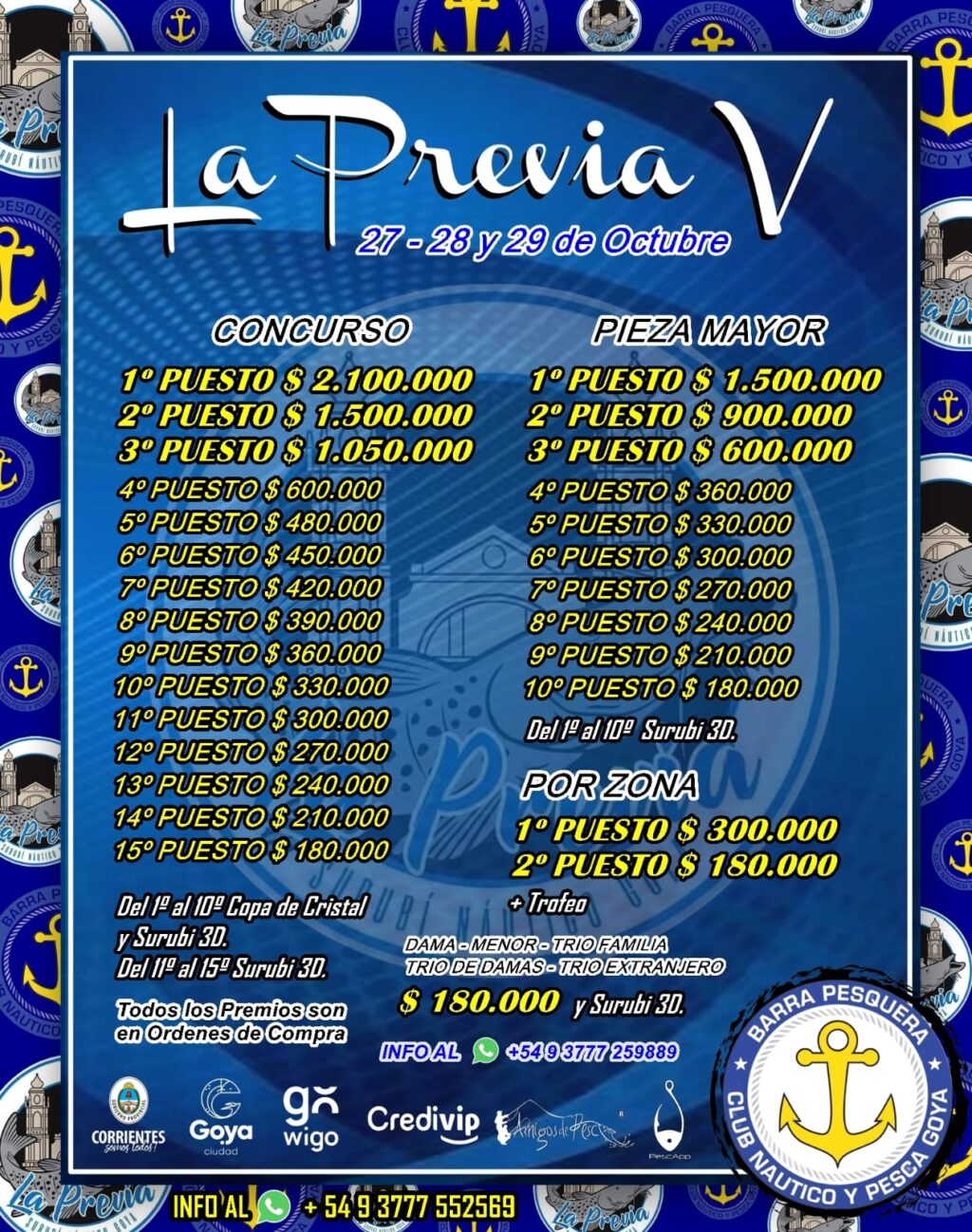 El concurso de pesca deportiva con devolución distribuye 19.000.000 de pesos en premios, vale mencionar en órdenes de compras, trofeos y el característico premio “el Surubí en 3D” al igual que la Copa Challenger.