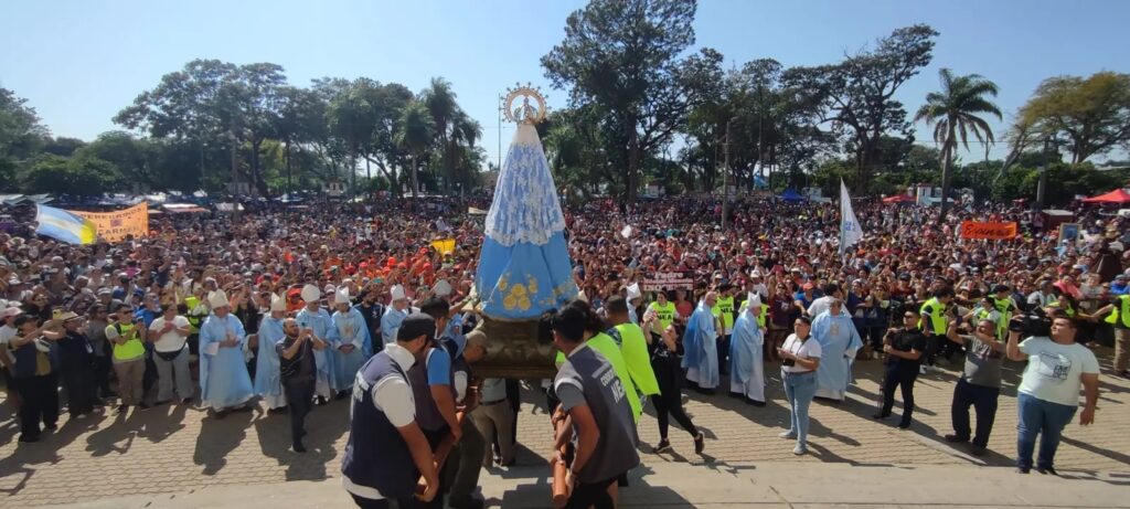 El oficio religioso fue seguido por miles de peregrinos llegados desde distintos puntos del Nordeste Argentino con invocaciones a la Virgen Morena y el lema “Con María, vayamos sin demora al encuentro de Jesús”