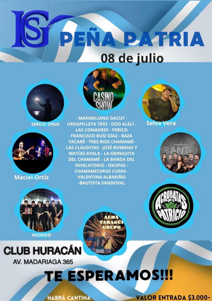 Este martes 8 de julio, se realizará la Peña Patria del Instituto Superior Goya, en el salón del club Huracán (Av. Madariaga 365) a partir de las 21.30 horas.