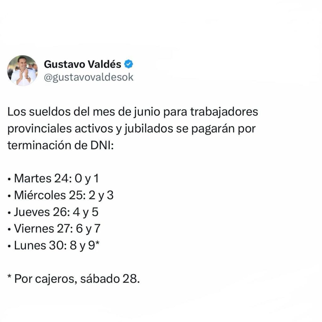 A través de sus redes sociales, @gustavovaldesok, el primer mandatario de Corrientes Gustavo Valdés confirmó la ejecución del cronograma de pago de haberes de junio a los agentes de la administración pública provincial (activo-jubilados-pensionados) a partir de este martes 24 y en cinco días.